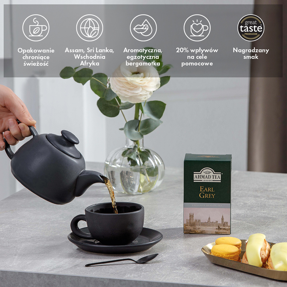 Earl Grey to kwintesencja angielskiego naparu, idealny dla osób poszukujących eleganckiej, wyrafinowanej filiżanki. Kojąca, ale podnosząca na duchu, jest to jedna z najwyżej ocenianych herbat naszych klientów. Arystokratka wśród herbat. Lekka mieszanka orientalnych herbat wzbogacona olejkiem z bergamoty. Ulubiony napój Anglików, który znalazł rzesze wielbicieli w Polsce. Herbata zazwyczaj serwowana bez dodatków. Aby stworzyć tę charakterystyczną mieszankę, Mistrzowie Herbaty równoważą herbaty z Afryki Wschodniej i Indii. Używamy wysokiej jakości liści kenijskich, aby nadać naparowi żywy, rześki smak. Uzupełnieniem tego jest odrobina egzotycznych cytrusów z naszego ekskluzywnego aromatu bergamotowego. Większe liście użyte w naszym luźnym liściu Earl Grey dają bardziej wyrafinowany smak, idealny dla wymagających miłośników herbaty.