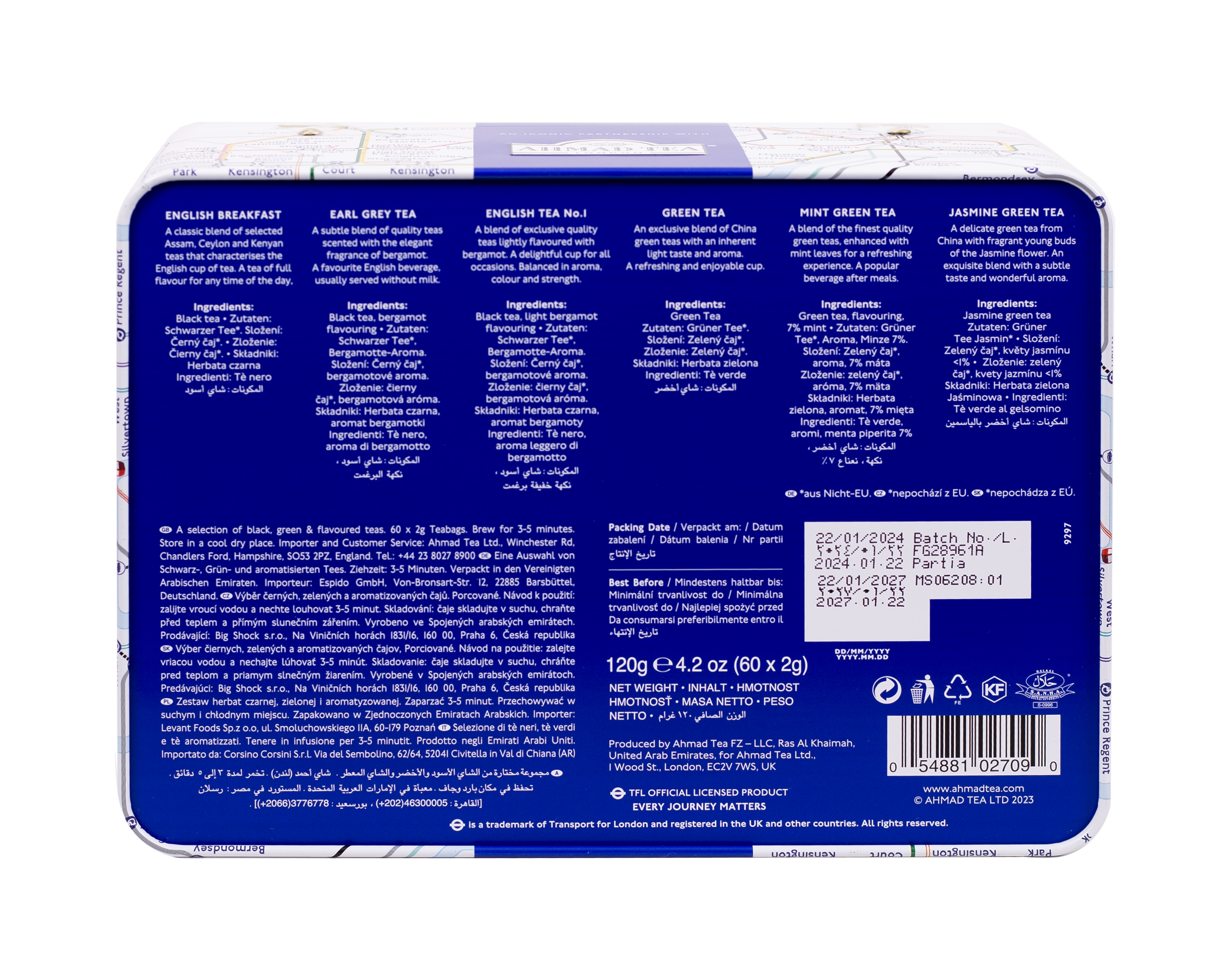 Kolekcja Ahmad Tea London Underground to elegancki zestaw prezentowy herbat, który oferuje starannie dobrany wybór wysokiej jakości mieszanek dla wszystkich miłośników herbacianych rytuałów. Zestaw zawiera 60 torebek herbaty, łącząc klasyczne czarne herbaty, aromatyczne herbaty zielone oraz orzeźwiające mieszanki owocowe.